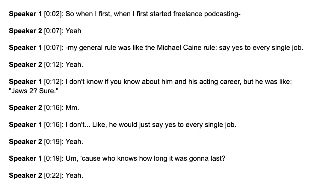 When I first started freelance podcasting, my general rule was like the Michael Caine rule: say yes to every single job. Like, he would just say yes to every single job 'cause who knows how long it was gonna last? "Jaws 2? Sure."